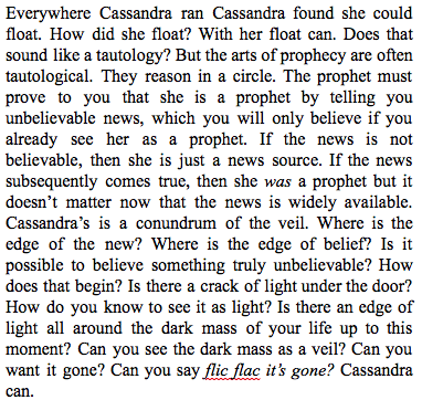 The absolute genius of Float is that Carson is able to make a radical statement of novelty through one of the most integral formal aspects of the poetry collection as a genre. At least personally, when I envision the archetype of a poetry collection, I see a book object including a linear progression of poems, each starting on a new page, divided, sometimes thematically in conversation with one another, but more often just a selection of the poet’s so-called best pieces from a certain period of time. Now think about Float. It is a collection of 22 separate chapbooks—essays, long poems, dialogues, translations, lists—to be read in no particular order, guarded in a transparent box, texts floating, so to speak, in their independent status as writing simultaneously together and separate. Innovative! This has never been done before! Yes and no. For isn’t a gathering of non-connective poetic parts the very definition of what is recognized as an anthology?