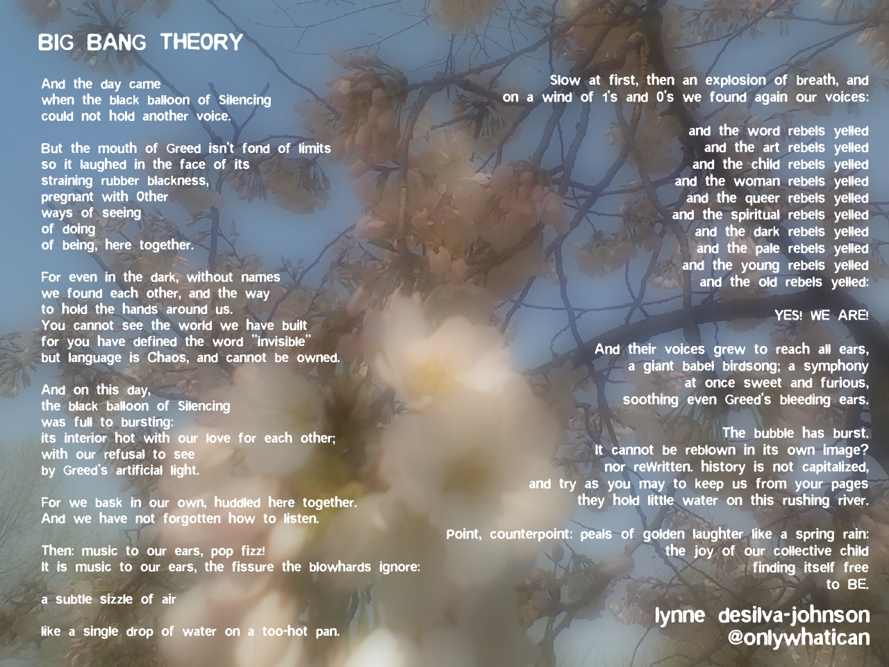 Below you can see the visual I created for my piece, Big Bang Theory. If you create hybrid pieces like this, or have ever been inspired to, we would love to showcase these inter-media-ry explorations either here or in our print publication (as suits each entry).