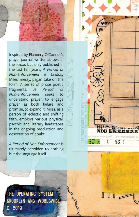 Inspired by Flannery O’Connor’s prayer journal, written at Iowa in the 1940s but only published in the last ten years, A Period of Non-Enforcement is Lindsay Miles’ messy, pagan take on the form. A series of prose poetic fragments, A Period of Non-Enforcement seeks to understand prayer, to engage prayer as both failure and promise, to expand it. Miles, as a person of eclectic and shifting faith, employs various physical, psychic, and literary landscapes in the ongoing production and desecration of doubt. A Period of Non-Enforcement is ultimately beholden to nothing but the language itself.