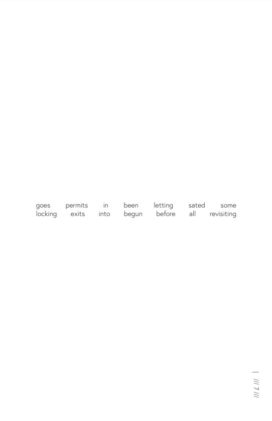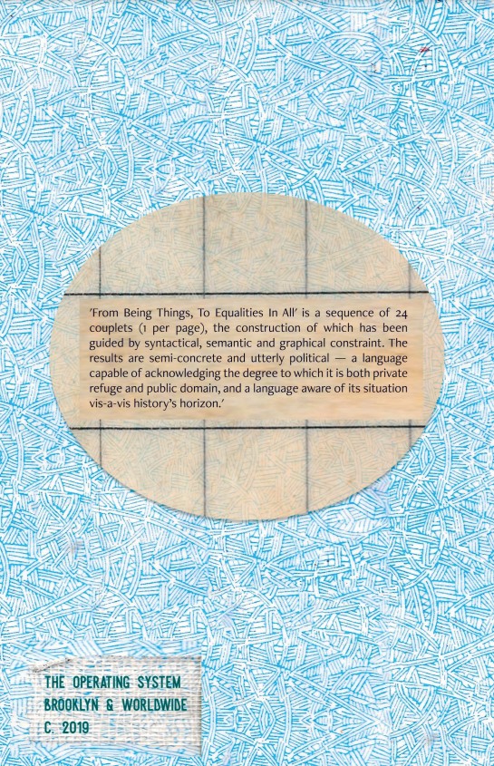From Being Things, To Equalities In All is a sequence of 24 couplets (1 per page), the construction of which has been guided by syntactical, semantic and graphical constraint. The results are semi-concrete and utterly political — a language capable of acknowledging the degree to which it is both private refuge and public domain, and a language aware of its situation vis-a-vis history’s horizon.