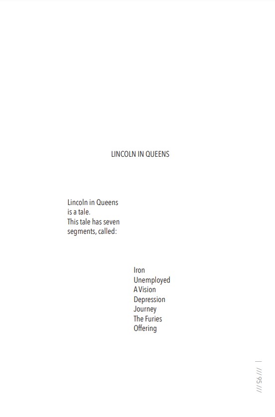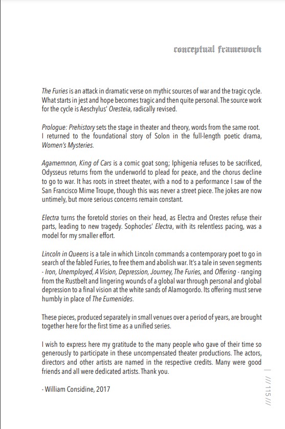 The Furies is an attack in dramatic verse on mythic sources of war and the tragic cycle. What starts in jest and hope becomes tragic and then deeply personal. “Prologue: Prehistory” sets the stage in theater and theory. “Agamemnon, King of Cars” is a comic goat song; Iphigenia refuses to be sacrificed, Odysseus returns from the underworld to plead for peace, and the chorus decline to go to war. Electra turns the foretold stories on their head, as Electra and Orestes refuse their parts, leading to new tragedy. “Lincoln in Queens” is a tale in which Lincoln commands a contemporary poet to go in search of the fabled Furies, to free them and abolish war. It’s a tale in seven segments — Iron, Unemployed, A Vision, Depression, Journey, The Furies, and Offering — ranging from the Rustbelt and lingering wounds of the great war through personal and global depression to a final vision at the white sands of Alamogordo. These pieces, produced separately, are brought together here for the first time as a unified series.
