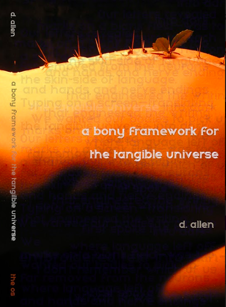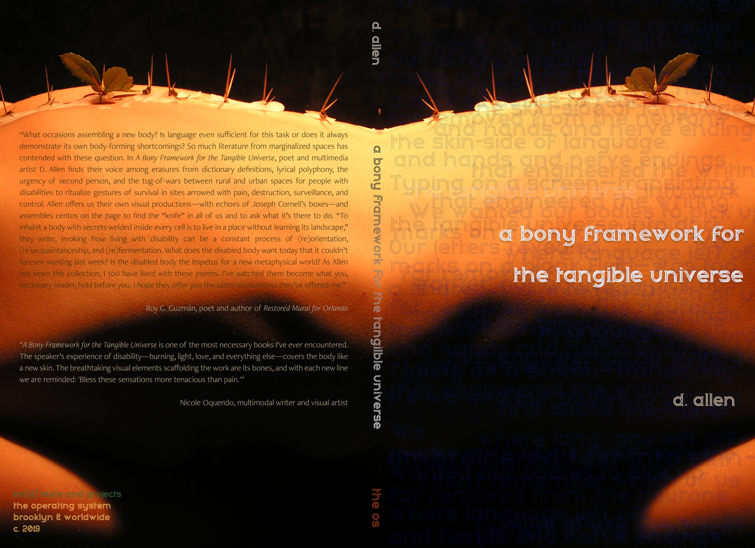 D. Allen is a queer poet and multidisciplinary artist whose work often examines gender, intimacy, disability/illness, and the natural world. Their work takes many forms: word architectures, painted surfaces, light drawings, textured sounds, soft spaces, slow dinners, sustained listening, tender assemblages, quiet gardening, deep breaths. They value each of these endeavors equally. D. earned an MFA from The University of Minnesota, and has received a VSA Minnesota Emerging Artist Grant, a Minnesota State Arts Board Artist Initiative Grant, a Minnesota Emerging Writers' Grant from The Loft Literary Center, and a Michael Dennis Browne Fellowship. They have been an artist in residence at Mallard Island, The Lighthouse Works, Write on Door County, the H.J. Andrews Experimental Research Forest, and The Atlantic Center for the Arts, and their work has been published in Rogue Agent, District Lit, Black Warrior Review, QDA: A Queer Disability Anthology, and elsewhere. A Bony Framework for the Tangible Universe is D.'s first book.