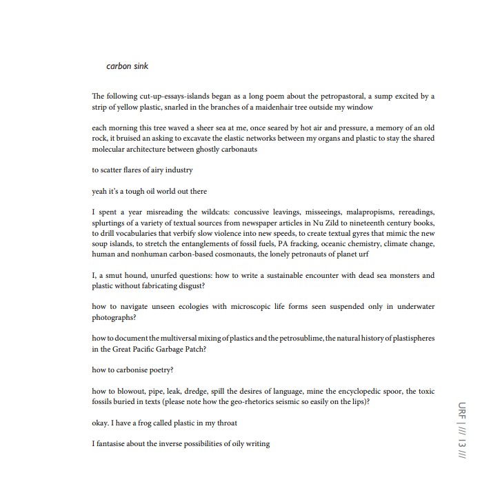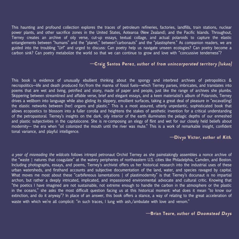 a year of misreading the wildcats unravels a sprawling, year-long encounter with petroleum that began with a strip of plastic, caught between the branches of a maidenhair tree. This hybrid collection of poetry, prose and Polaroid photography drills the archive for film scores, fiction, and scholarship to recover the intertextual saturations of plastic and plankton, oil and oceans. Toggling between phantom islands and garbage gyres, the Pacific and Pennsylvania, a year of misreading the wildcats documents the impossible project of both environmental literature and photography to critique and catalogue disaster. This collection is a refusal for a narrative, where climate change denies the islands’ one.