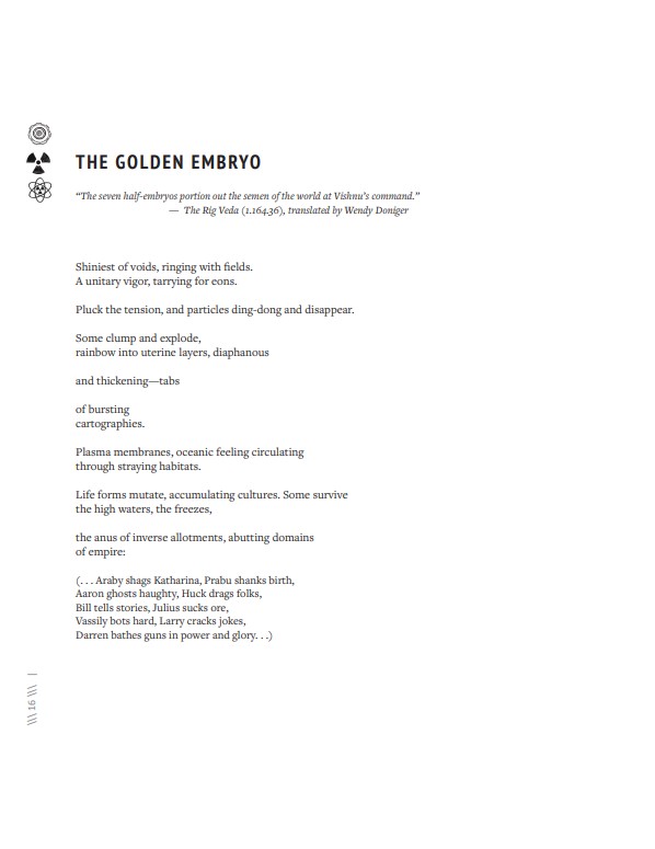 “The book completes what, in life, was incomplete: a father-daughter collaboration, the ‘glowing-seething archive’ of energies as yet unconsolidated, yet unleashed. Vidhu Aggarwal’s DAUGHTER ISOTOPE is contra-fate, written with ‘silt and fronds,’ traveling alongside the ovule-corpse, the otherbody of what in global English might be called a Goddess but here is closer to an act of adoration, a ‘sumptuary pulse.’ Hanuman dilates then contracts, boson to supernova, and here in the Kill Room, ‘subjects’ are ‘seeking their bodies.’ The Mahabarat: an epic never intended to be read aloud in a consecutive sequence, or time, or by one person. For this reason, Aggarwal’s collection, which edges beyond literature into ‘feverish, makeshift’ codes and indices, the ‘combustive interior’ habitat of a massive and multiple online persona, was exhilarating to read.” — Bhanu Kapil