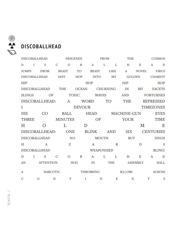 “Vidhu Aggarwal’s DAUGHTER ISOTOPE chants squishy myth vortexes to recode your bodymind. Give yourself to decay and renewal. Play with ‘sacred raging atoms.’ DAUGHTER ISOTOPE is a high-energy mélange of the holy and the profane, visual and visceral. Aggarwal drives a cloud-computing daughter into careening slingshots around gods to launch into digital dis/re/embodiment. Fragments come back as lights of a disco ball that becomes a head, or as a cow that speaks. All translate bio-function into digital data and back again, where the ‘atlas spurts out of my belly and breath.’ Aggarwal’s language soars and sparks, and my gut vibrates in futuristic sympathy when I read of ‘fine-scale filamentous heterogeneities/hosed through the eruptive stoma / of the melt generation’.” — Petra Kuppers