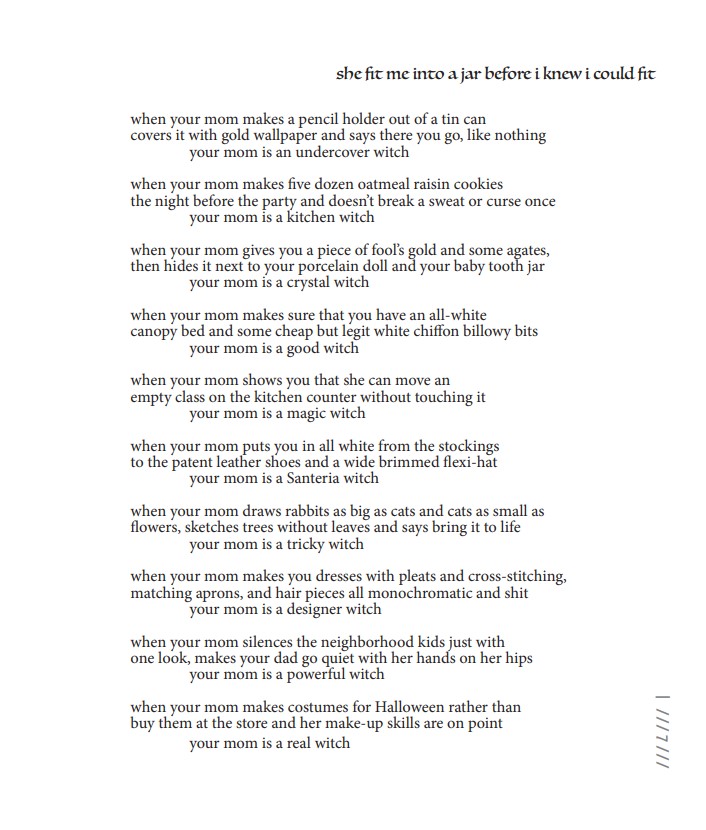 “Janeksela’s Fitting a Witch // Hexing the Stitch is part lyric, part invocation and part spiritual memoir. She contemplates the thin lines between upbringing, religion and spirituality in a well-wrought text that sheds light on the ‘dark’ arts. There is no darkness in Janeksela’s lyrics; there is light, freedom and the power to deftly create one’s present existence from the raw materials of the past.” — Airea D. Matthews