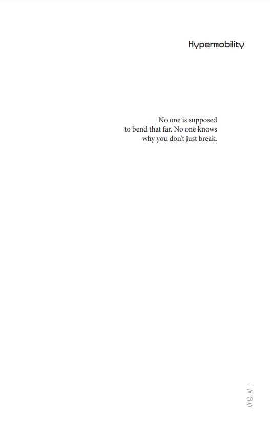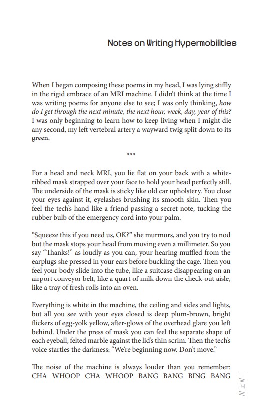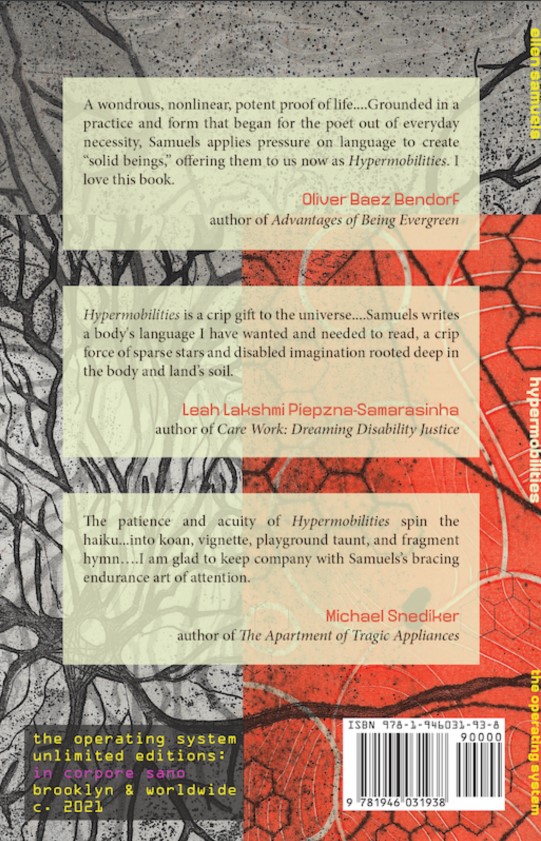 Hypermobilities is a verse-memoir in haiku, written over two years of intense engagement with the medical system. Samuels composed these poems in her head while strapped down within MRI machines, in the infusion center with IV needles snaking her arms, waiting and waiting in white-walled rooms. They are necessarily short, to be written by memory without pen or screen. A selection of these poems eventually formed into this collection, named after the hallmark sign of her genetic condition: joint hypermobility.