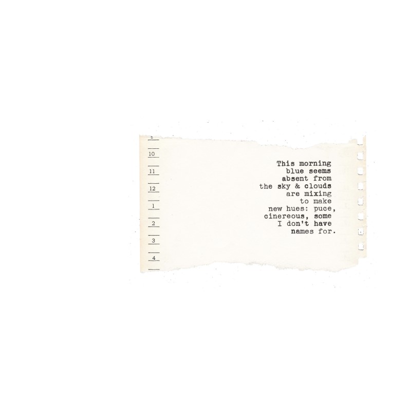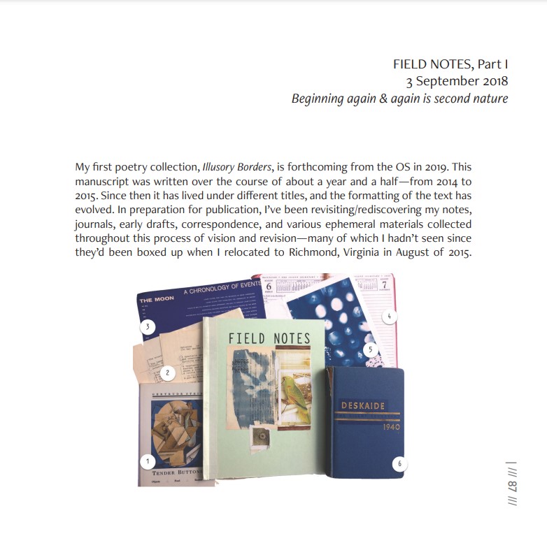 Illusory Borders is grounded in a process that incorporates fragments, lists, and reflections on ‘woman’s work.’ It is inspired, in part, by lists discovered in a woman’s day-planner from the 1940’s (a DailyAide Silent Secretary), as well as an erasure created a few years ago from Gertrude Stein’s Tender Buttons — in particular, the section titled “Objects.” This erasure became a list poem which was explored/enacted in different ways over time, eventually creating a series of prose poems/a long poem stitched together by fragments that cut and collaged from that original list. This series/long poem seeks to expand liminal spaces, marginality, the unsaid, the footnotes of dailyness and everyday objects, as well as the artist’s necessity of working in a series: continually ending and beginning.
