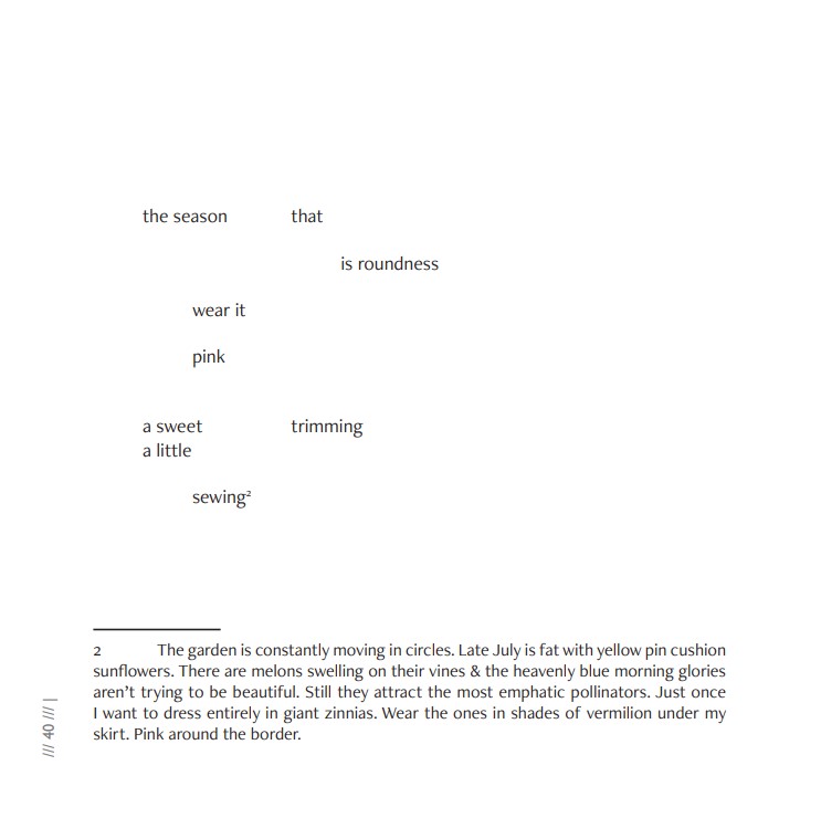 “Heidi Reszies’s book, Illusory Borders, wanders intriguingly along the edges of what making is: making a world, a garden, a book / making textiles, pictures, poems / making a home, making a way, making a life. In all these permutations of forging, which is to say apprehending, Reszies creates a constellated texture of convergence as the natural world moves through its life cycle, burgeoning and brimming and collapsing, and the interior world moves alongside, filling in the emotional gaps with guesses and glimpses of light. The poems themselves are scattered like seeds over the pages, spacious and spare, annotated with the ideas that exist–invisible but felt–in the in-between. Indeed, the majority of the text falls in what might be called the margins, the periphery, layering a delicate archive of moods throughout the pages, tenderly yielding a place for the smallest, most glimmery shred of hope to bloom like breath against glass that, when finally cleared, gives ‘a window inside another window inside.'” — Allison Titus