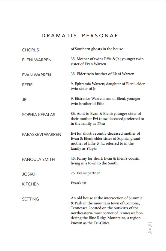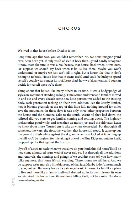 In Still Rooms is more than a haunted house novel — a strange hybrid drawing its aesthetic equally from ancient Greek drama, ecopoetics, and the Gothic tradition. Set in an old house in rural East Tennessee, three generations of a Greek-American family mourn the loss of a matriarch who reveals herself to each of them uniquely. Regardless of the family’s comings and goings, the reader remains always in the house. In this house, religion, mythology, and superstition all rule equally. In this house, saints speak to mothers from their plaques on the wall; ancient deities manifest in the minds of children; a Chorus of those who have previously died there address the reader directly; and ultimately, the house itself begins to speak.