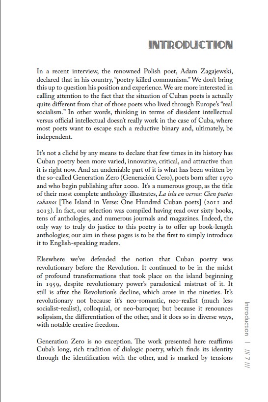 Though they are relatively isolated, whether it be because of extremely limited access to the Internet or the difficulties of traveling off the island, Generation Zero poets aren’t behind the times at all, on the contrary, they are at the forefront of poetry being written anywhere in the world. Here there’s no trace of superficiality, no fear of emotional complexity or intellectual density, of formal rigor or experimentation. It’s poetry open to reality and the most diverse forms of representation. The authors know that intellectuals participate in society through their cultural production.