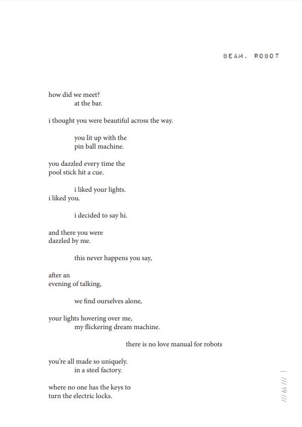 A collection of love poetry that undercuts and reassembles narratives, LOVE, ROBOT is an experimental text that humanizes our relationship with technology. Through liaisons between humans and machines in a science fictional world, the collection offers a tense, playful, yet complex portrait of love, reflective of our contemporary moment. Rhee draws from a wide array of forms from poetics and robotics such as algorithms, narrative poetry, chat scripts, and failed sonnets to create a world of transgressive love. This vision of an artificially intelligent future reveals and questions the contours of the human, and how robots and humans fall in and out of love.
