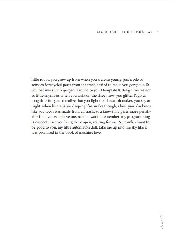 “Poetry is rightly destroyed and rebuilt in the abrasive caress of we whose claims upon the human, having constantly been denied by man, put the human to the test. It’s still held by many to be a scientific fact that the humanities are not for us. At the same time, surrounding that dimensionless enclosure, whose inside and outside we refuse, we are the humanities, that fleshly mechanics, and LOVE, ROBOT is a missive from that ongoing refusal. ‘I know it hurts. But/code fails’ so beautifully in Margaret Rhee’s hand and ear. ‘The world was not made for love,’ she says. So let’s follow her on out of it.” — Fred Moten