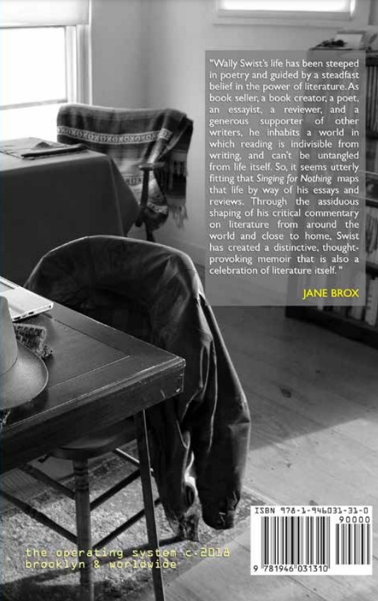 “Wally Swist’s life has been steeped in poetry and guided by a steadfast belief in the power of literature. As book seller, a book creator, a poet, an essayist, a reviewer, and a generous supporter of other writers, he inhabits a world in which reading is indivisible from writing, and can’t be untangled from life itself. So, it seems utterly fitting that Singing for Nothing maps that life by way of his essays and reviews. Through the assiduous shaping of his critical commentary on literature from around world and close to home, Swist has created a distinctive, thought-provoking memoir that is also a celebration of literature itself.” — Jane Brox