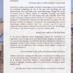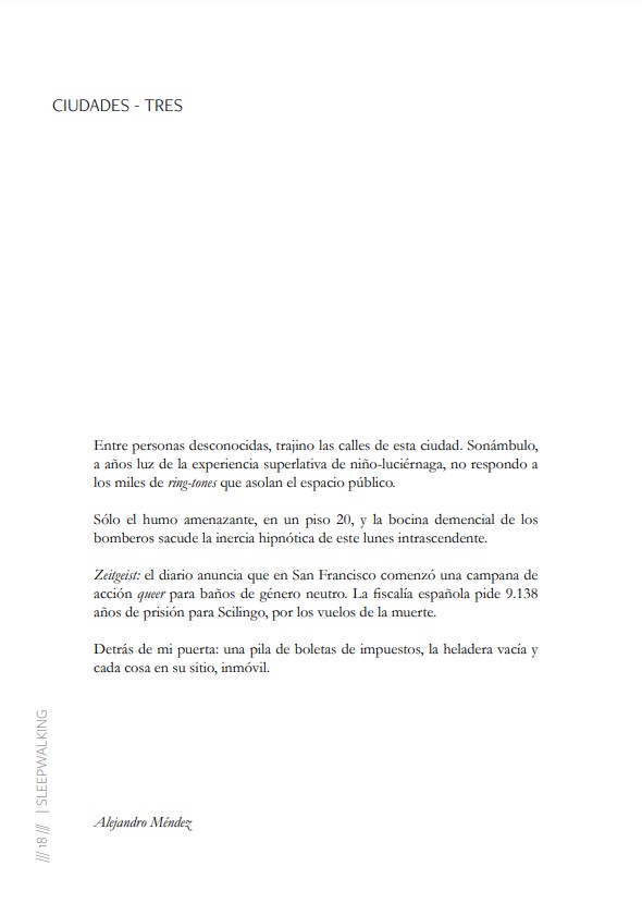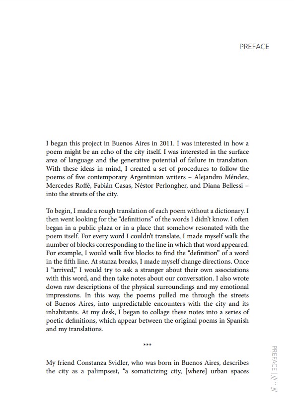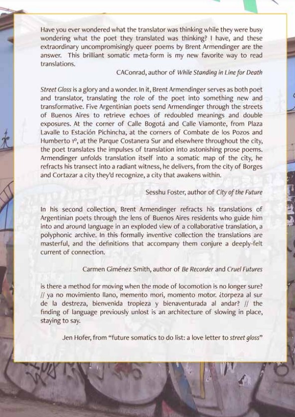 In this experimental translingual work, Brent Armendinger follows the work of five contemporary Argentinian poets into the streets of Buenos Aires, attempting to map the ways a word might be an echo of the city itself. Interested in the surface areas of language and the generative potential of failure in translation, the author follows a set of procedures oriented simultaneously in the lines as well as in the streets of the city, gathering impressions, associations, and language through unpredictable encounters with the place and its inhabitants. Notes from these encounters appear interlaced, here, between the original poems in Spanish and their translations. Featuring poems by Alejandro Méndez, Mercedes Roffé, Fabián Casas, Néstor Perlongher, and Diana Bellessi, and artwork by Alpe Romero.