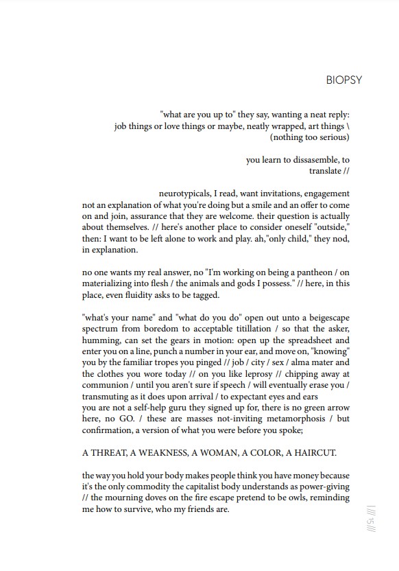 Sweet and Low: Indefinite Singular is an artist’s book, of a cellular cluster using text as a medium through which to understand “body,” “systems,” and communicative possibilities. The pain of that body, the mirrors and lack thereof, the strangeness of sound on the tongue becoming concrete, an alchemy towards ink and paper, a transmutation that hopes for healing for “self” and “other,” for biome and kin. What does it mean if your practice is [questions]? What muscular yearning can be spat into paginated form, and plant, as seed, as rhizome? This, a foray. A void containing.