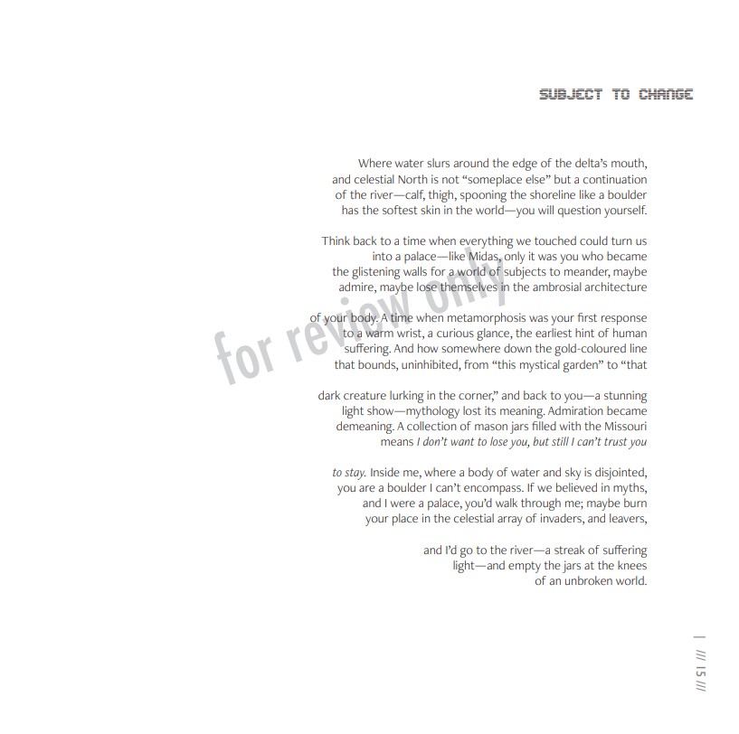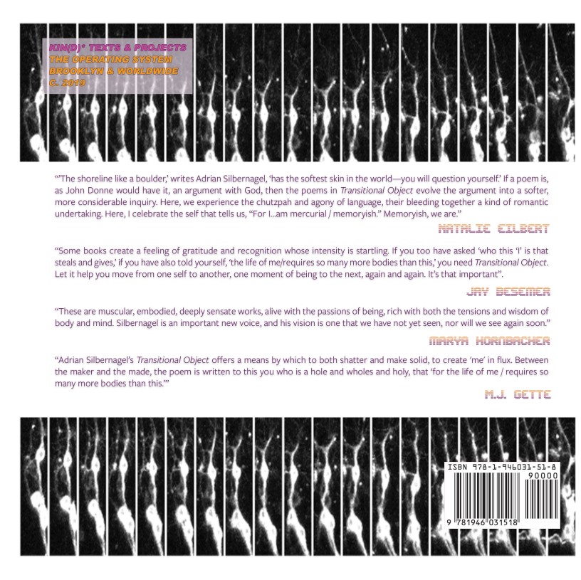 In developmental psychology, transitional objects are objects to which young children develop intense and persistent attachments in unstable situations — a tendency which some psychologists link to the processes of individuation, ego development, the birth of memory, the capacity for empathy and object-relations, the capacity for symbolization, and other formative capacities. Transitional Object, a debut work by Adrian Silbernagel, can be described as a poetic inquiry into the conditions of personal identity or selfhood, in which the poems themselves become the objects to which the developing speaker clings as the various components of their identity — their gender, sexuality, religious beliefs, familial relations, and formative relationships — are called into question.